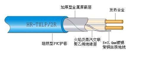 它結(jié)構(gòu)包括有:護套:藍色聚氯乙烯( PVC );   接地線:鍍錫銅絲;   屏蔽層:鋁箔 + 銅絲; 內(nèi)導(dǎo)體:合金電阻絲+銅絲; 內(nèi)絕緣:交聯(lián)聚乙烯( XLPE );
