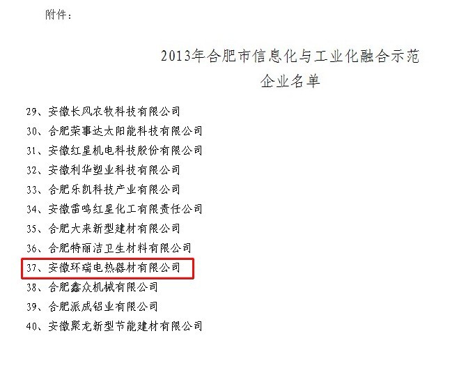為加快推進(jìn)我市兩化深度融合,發(fā)揮典型示范作用,依據(jù)《合肥市信息化與工業(yè)化融合示范企業(yè)認(rèn)定管理辦法(試行)》和《合肥市第三方企業(yè)信息化公共服務(wù)平臺(tái)認(rèn)定辦法(試行)》等文件,經(jīng)企業(yè)申報(bào)、縣區(qū)推薦、專家評(píng)審和綜合審查,現(xiàn)確定安徽環(huán)瑞電熱器材有限公司,等40家為2013年合肥市     安徽環(huán)瑞將積極響應(yīng)政府的有關(guān)倡導(dǎo):不斷提升自身信息化應(yīng)用水平,切實(shí)發(fā)揮示范企業(yè)帶動(dòng)作用,認(rèn)真總結(jié)信息化建設(shè)經(jīng)驗(yàn),積極探索利用信息技術(shù)推動(dòng)產(chǎn)業(yè)升級(jí)轉(zhuǎn)型,發(fā)展新型業(yè)務(wù)模式,培育新業(yè)態(tài),走出一條合肥特色的信息化與工業(yè)化深度融合的“科技環(huán)瑞”的發(fā)展道路,促進(jìn)電伴熱帶,發(fā)熱電纜產(chǎn)業(yè)結(jié)構(gòu)優(yōu)化升級(jí),最終為振奮合肥的經(jīng)濟(jì),做出貢獻(xiàn)!