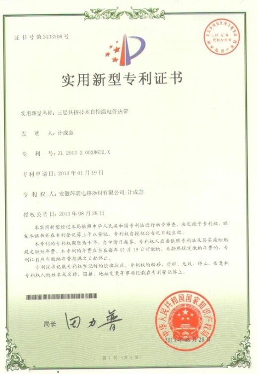 環(huán)瑞自成立研發(fā)小組至科學技術中心期間,通過獨立開發(fā),與合肥工業(yè)大學建立長期合作關系,聘請相關專業(yè)的技術專家等模式,投入大量的人力物力。我司以安全,實用性能為目標,對電伴熱帶結構、原材料、生產工藝進行創(chuàng)新,最新研發(fā)的“三層共擠自控溫電伴熱帶”“ 塑料導體的安全型自控溫電熱帶”獲得了2項國家專利證書。我司已獲得了5項關于自限溫伴熱帶的國家專利證書,我司伴熱帶的生產技術已達到國內先進。共計19項專利。新的專利證書已下達。