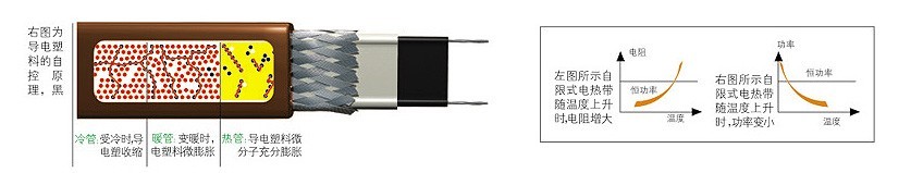當(dāng)溫度升高時,導(dǎo)電塑料產(chǎn)生微分子的膨脹,碳粒漸漸分開,引起電路中斷,電阻上升,伴熱線會自動減少功率輸出。