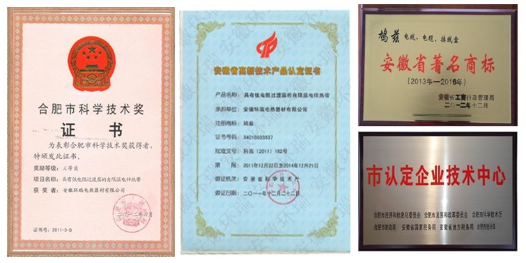 安徽環(huán)瑞擁有21項自主知識產(chǎn)權(quán),其中包括:2項國家發(fā)明專利;4項新型電伴熱帶、發(fā)熱電纜生產(chǎn)核心技術(shù)(1、雙層共擠技術(shù),2、束代絞預(yù)恒張力絞線,3、一體化熱線冷線隱式拼接,4、三層共擠技術(shù));5項核心新型產(chǎn)品(1、具有低電阻過渡層的電伴熱帶,2、一種安全塑料體的電伴熱帶,3耐高溫耐磨的發(fā)熱電纜,4、太陽能熱利用電伴熱帶,5、新型長距離并聯(lián)、串聯(lián)恒功率電熱帶);10項行業(yè)專用電伴熱帶(消防專用電伴熱帶、電廠煙氣脫硫?qū)S秒姛釒?、太陽能熱水器本質(zhì)安全型電熱帶、石油管道伴熱專用電熱帶、汗蒸房專用電熱帶、天溝融雪專用發(fā)熱電纜、混凝土養(yǎng)護專用發(fā)熱電纜、畜牧養(yǎng)殖專用發(fā)熱電纜等)。安徽環(huán)瑞憑借此項榮譽獲得了省科學(xué)技術(shù)獎、高新技術(shù)產(chǎn)品證書及國家地暖行業(yè)、省建設(shè)廳榮譽推廣證書。