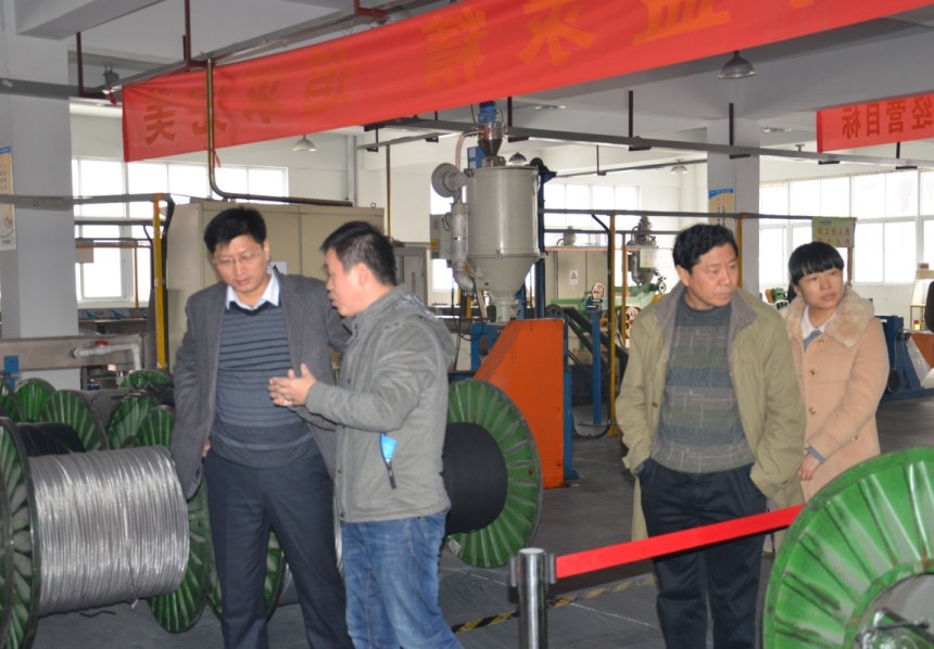 縣委孫書(shū)記、開(kāi)發(fā)區(qū)領(lǐng)導(dǎo)仔細(xì)聆聽(tīng)計(jì)總介紹關(guān)于我司自限溫電熱帶,恒功率電伴熱帶生產(chǎn)工藝流程