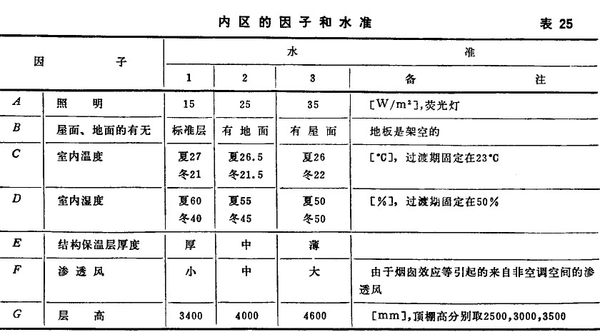 在表11中給出全年負(fù)荷計算方法的種類。在略算法中,根據(jù)實(shí)驗(yàn)設(shè)計法利用推斷表的方法,是在對負(fù)荷的大小有影響的因素(例如窗面積比)的幾個水準(zhǔn)(例如20%, 40%,60%三個水準(zhǔn))中選出一個,只要用簡單的加減運(yùn)算便可求出負(fù)荷某種程度的增加或減少,因而是非常便利的。這里給出的是由日本建筑學(xué)會節(jié)能小委員會作成的表。