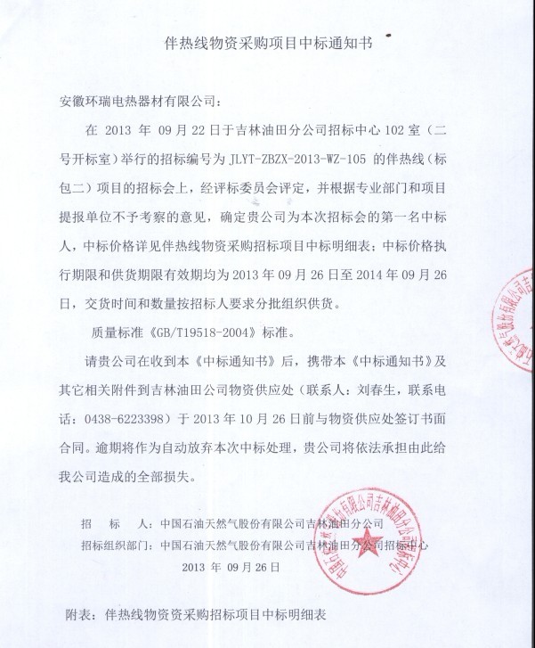此次成功競(jìng)標(biāo)吉林油田,也是甲方在去年使用過(guò)我司的電伴熱帶后做的慎重選擇,是對(duì)于我司電熱帶產(chǎn)品質(zhì)量的主要肯定。 本次項(xiàng)目包括自限溫、恒功率電熱帶兩大系列。目前正在緊張的進(jìn)行后續(xù)的項(xiàng)目合作中。以下為環(huán)瑞中標(biāo)通知書(shū)