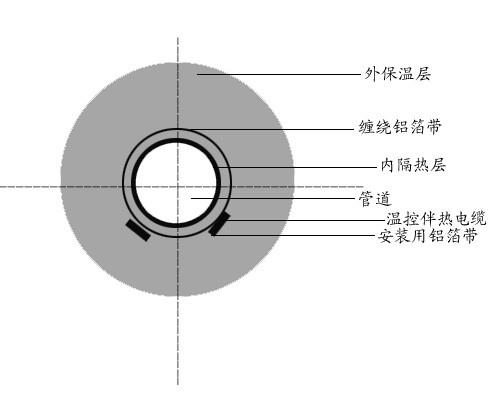 由于蒸汽掃線時間相對較短。一般控制在30分鐘左右??刹捎孟聢D雙層保溫結(jié)構(gòu)來保證使用。一般來說,這種結(jié)構(gòu)的內(nèi)層保溫厚度為5-10mm.在內(nèi)保溫層外加包鋁膠帶,鋁膠帶上敷設自控溫電熱帶。每毫米內(nèi)層保溫層可使掃線溫度減低10℃左右,或采用隔離支架,每米1—2只,效果也較理想。當然,在掃線時必須停止通電,管線熱損失仍按常規(guī)設計,保溫層厚度只能按外層為計算厚度。