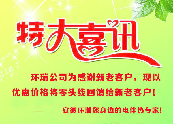 為感謝新老客戶對環(huán)瑞公司發(fā)展給予的支持,現(xiàn)有零頭線將以優(yōu)惠價回饋給新老客戶,歡迎廣大新老客戶咨詢訂購,環(huán)瑞十年專注電伴熱產品研發(fā),品質保證。