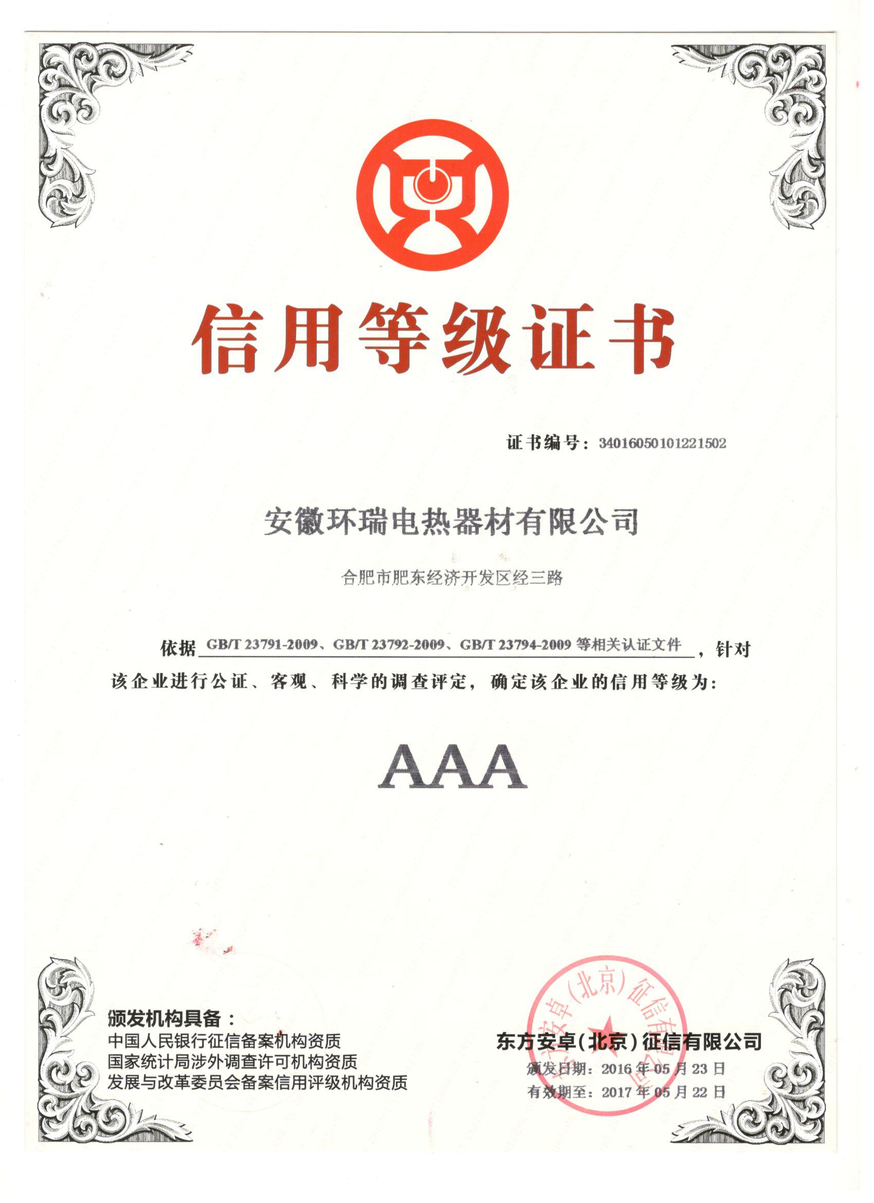 誠信是中華民族的傳統(tǒng)美德,誠信是一個企業(yè)立命之根,誠信是一個企業(yè)發(fā)展之本。“AAA”作為一個誠信的標志,是對企業(yè)基本信息、綜合指標、經營發(fā)展、信用記錄等各個方面行為全方位的評價,熱烈慶祝安徽環(huán)瑞電熱器材有限公司榮獲 “企業(yè)AAA級信用等級證書”。