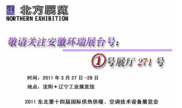 2011年3月27日-29日,安徽環(huán)瑞參加?xùn)|北國(guó)際供熱空調(diào)設(shè)備展覽會(huì)。屆時(shí),我們公司將展出公司的新型技術(shù)產(chǎn)品。希望廣大新老客戶來(lái)我展臺(tái)參觀洽詢,我們的展會(huì)人員將以飽滿的情緒接待來(lái)至世界各地的每一位關(guān)注我們安徽環(huán)瑞的貴客。