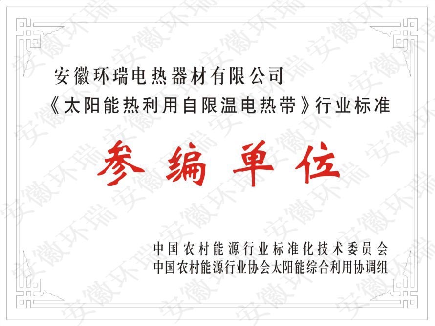 安徽環(huán)瑞電熱器材有限公司長(zhǎng)期致力于自限溫電伴熱帶在各行業(yè)的應(yīng)用,尤其是太陽(yáng)能專用自限溫電伴熱帶,并研發(fā)出一種安全節(jié)能的太陽(yáng)能電伴熱帶-納米阻燃本質(zhì)安全型電熱帶,獲得了國(guó)家專利證書和省高新技術(shù)產(chǎn)品,針對(duì)目前國(guó)內(nèi)層次不齊的電熱帶質(zhì)量,為了規(guī)范太陽(yáng)能電熱帶的市場(chǎng),提高產(chǎn)品的質(zhì)量。安徽環(huán)瑞與多家電伴熱同行企業(yè)共同起草《太陽(yáng)能熱利用自限溫電熱帶》,此標(biāo)準(zhǔn)由中國(guó)農(nóng)村能源行業(yè)協(xié)會(huì)提出。能源行業(yè)農(nóng)村能源標(biāo)準(zhǔn)化技術(shù)委員會(huì)歸口,是專門針對(duì)太陽(yáng)能行業(yè)的自限溫電熱帶標(biāo)準(zhǔn),具有重要意義。